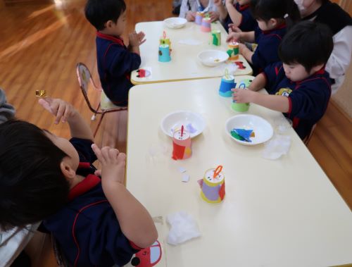 きりん組さんは、ハンドベル製作と楽器遊びをしました。製作では、おうちの方のお手伝いもありながら素敵なベルが完成しました🔔その後、クリスマスの歌を歌ったり、作ったベルを鳴らしながら合奏を楽しみました🎶