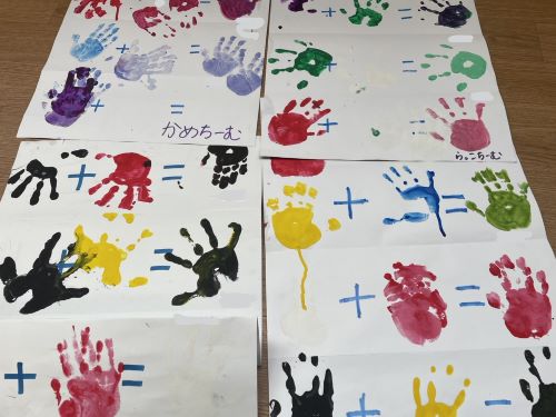 楓組では、色の実験をしました。色々な絵の具の中から、自分で選んで右手左手につけ、二つの色を混ぜると何色になるのか、ワクワクしながら取り組む子どもたちでした♪次は、混ぜた色を友達とまた合わせるとどうなるのかを実験しようと、お家の方が帰った後も盛り上がった楓組さんでした⭐️