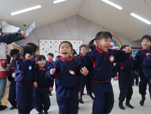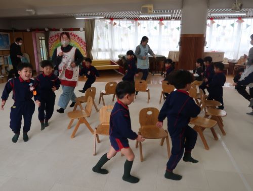 ホールでは、〇×クイズやじゃんけん列車、椅子取りゲームを楽しみました🎶今回はおともだちとペアを組み、力を合わせてゲームに参加しました👍じゃんけんで負けて悔しがる姿や、おともだちを応援する姿など、様々な表情が見られました✨