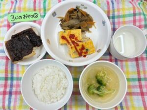 今日のメニューは、ごはん、コンソメスープ、きのこのオムレツ、きんぴらごぼう、牛乳です。オムレツは、きのこの他にもお野菜やお肉もたっぷり入っていました😋3時のおやつは、ココアトーストです。