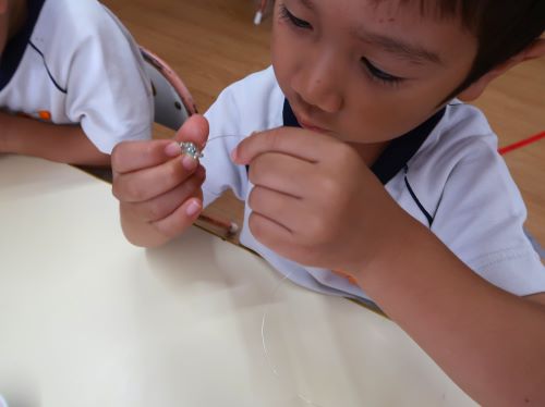楓組さん、今週もよく頑張りました‼今日は、本番で身に付けるネックレス作りをしました。何度か糸通しなど、手先の運動をしてきましたが、久しぶりにやってみてビックリ👀