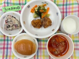 今日のメニューは、パン、ミネストローネ、鶏の唐揚げ、イタリアンサラダ、牛乳です。爽やかなミネストローネ、小さいおともだちにも結構人気があるんです😋3時のおやつは、梅ひじきおにぎりです。