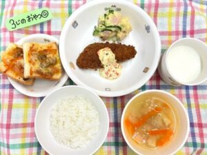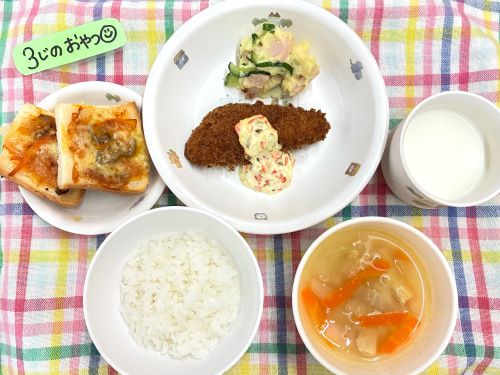 今日のメニューは、ごはん、みそ汁、鮭のフライ、ポテトサラダ、牛乳です。ボリュームたっぷりのフライでしたが、タルタルソース効果でペロっと食べ終わりました😋3時のおやつは、ピザトーストです。