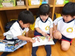 練習後のクールダウンに、絵本を見ました📖以前は一人一冊で読んでいましたが、今は言葉も出てくるようになり、おともだちと一緒にお話を楽しみながら見ることができるようになりました🎵