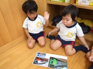 「この電車はね~」「これは〇〇マンだよ‼」など、好きな電車やアンパンマンのキャラクターのお話をしていました😆