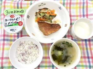 今日のメニューは、ゆかりごはん、みそ汁、赤魚の煮つけ、ごぼうサラダ、牛乳です。色んな調理法のお魚が給食に出ますが、煮魚はやわらかくて食べやすいですね😋3時のおやつは、カップヨーグルトです。