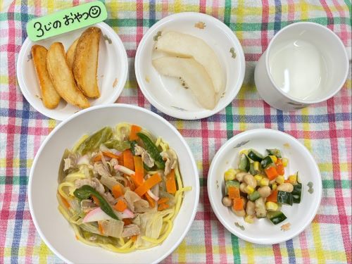 今日のメニューは、ちゃんぽん、大豆サラダ、梨、牛乳です。あま~い梨で、秋を味わいました😋3時のおやつは、フライドポテトです。
