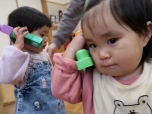 重ねたブロックを電話のようにして「もしもし~📞」色んな遊び方が見られてきています👏
