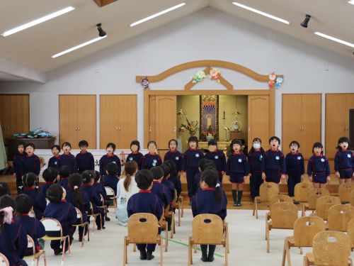 今日は、お遊戯会の報恩講の練習を梅・楓組のおともだちの前で行いました。いつもは松組さんだけで取り組んでいたため、前にお客さんがいることで緊張するかな?と思いましたが、そこは、さすがの松組さん‼ビシッとカッコイイ姿を見せてくれました✨