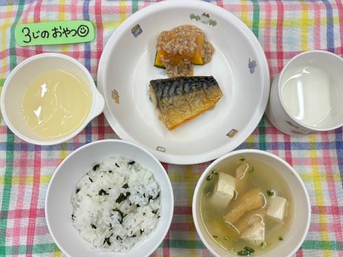 今日のメニューは、わかめごはん、みそ汁、サバの塩焼き、かぼちゃのそぼろ煮、牛乳です。ごはんにわかめが入っているだけで、食欲倍増でした😂3時のおやつは、りんごゼリーです。