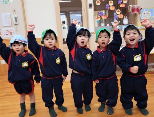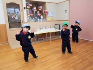 こちらも最後の練習の様子です。怪獣の帽子を身につけ、やる気満々のきりん組さんでした👏おうちの方々が写真や動画をとってくれていることをイメージしながら、元気いっぱい楽しく踊りました🎶