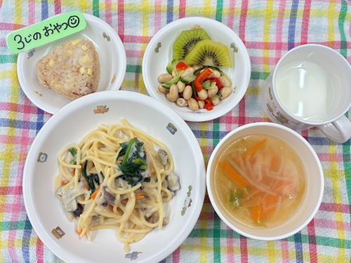今日のメニューは、クリームスパゲティ、鶏ガラスープ、大豆のマリネ、フルーツ、牛乳です。寒くなるとクリーム系のメニューが嬉しいですね😋3時のおやつは、おかかチーズおにぎりです。