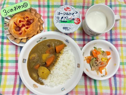 今日のメニューは、カレーライス、サウザンサラダ、カップヨーグルト、牛乳です。ホクホクのおいもさんが、ゴロゴロ入っていて大満足😋3時のおやつは、ウィンナーパンです。