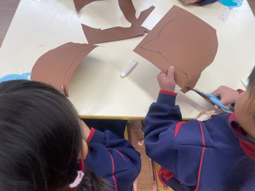 はさみでトナカイを切り、幼稚園沿いのイチョウの木から落ちてきた葉っぱを使って角の部分に貼ることにしました。