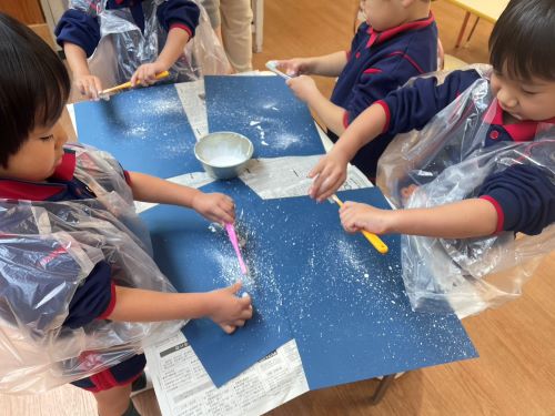 楓組さんは、クリスマス製作をしました🎄ブラッシング技法で「シュッシュ」と、雪を再現しました❄