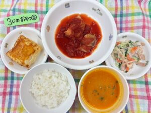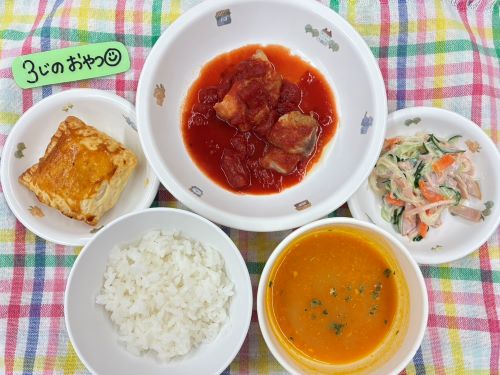 今日のメニューは、ごはん、かぼちゃスープ、鶏肉のトマトソテー、春雨サラダ、牛乳です。かぼちゃたっぷりの、なめらかスープであったまりました😋3時のおやつは、りんごパイです。