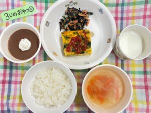 今日のメニューは、ごはん、コンソメスープ、スパニッシュオムレツ、ひじきサラダ、牛乳です。みんなが大好きなオムレツの中には、お野菜がぎっしりとつまっていました😋3時のおやつは、ココアプリンです。