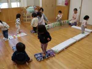 サーキット遊びを楽しんだうさぎ組さん!バランスよく牛乳パックの橋を渡ってみたり、ちょっと感触の良いペットボトルの上を歩いてみたり、おっとっと~となりながらも、落ちないように体勢をもどす姿が可愛かったです😊