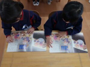 松組さんは、登龍館と若菜会をしました。今月は「ねずみの相撲」の絵本を読んでいます📖音読では、文字を指で追いながら読むことに挑戦していますが、今日は少し苦戦する姿が見られました。読んでいくうちに、少しずつ本との距離が近くなっていくおともだちも多かったため、腰骨を立てて、よい姿勢で読むことを意識して取り組んでいます✊