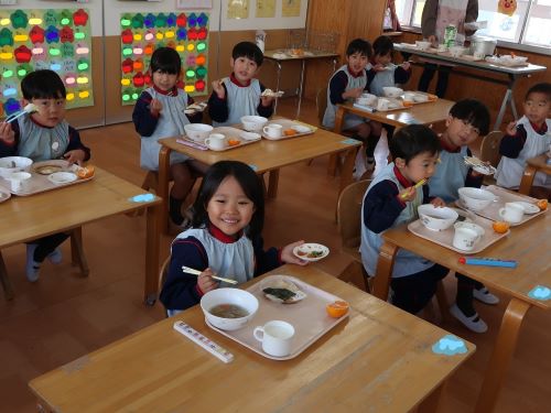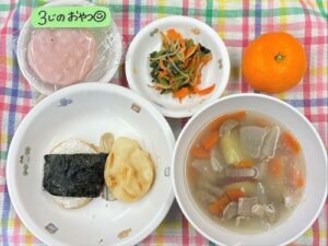 今日のメニューは、もち(未満児はわかめごはん)、豚汁、小松菜ごま和え、みかん、牛乳です。自分たちでついたお餅に、しょうゆや海苔、きなこなど、それぞれに好きな味付けをしていただきました😋3時のおやつは、自然館おかしです。