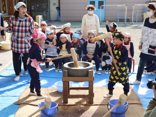 お米の話をして、いよいよ松組さんから餅つきスタート!みんな気合の入った「よいしょ~‼」の掛け声に合わせて、頑張って一人ひとりついていました😊