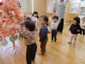 うさぎ組さんは、オーナメント作りでシール貼りをしました🎄上手に貼ることができ、順番に飾り付けをしました。その後、「あわてんぼうのサンタクロース」「ジングルベル」歌い、最後は「ヘイ✊😆‼」と元気な掛け声が聞けました🎶
