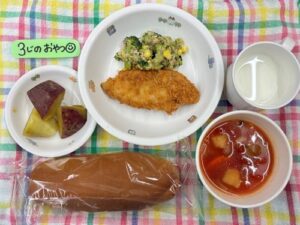 今日のメニューは、パン、ミネストローネ、白身フライ、ブロッコリーサラダ、牛乳です。食後に食器を下げに来た年長さんが「ブロッコリーがおいしかったです!」と、給食室に感想とごちそうさまを伝えていました😋3時のおやつは、ふかし芋です。