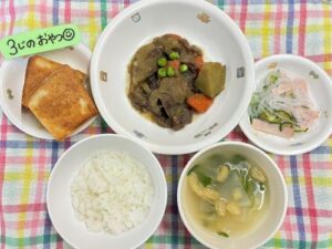 今日のメニューは、ごはん、みそ汁、肉さつま、春雨の酢の物、牛乳です。三隈幼稚園ばたけで採れた白菜・大根・ブロッコリーを使っています😋3時のおやつは、きなこトーストです。