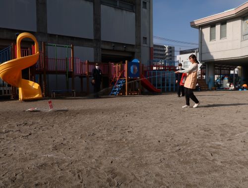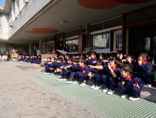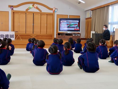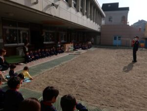 その後、ホールでクイズ形式のDVDを見ました。こどもたちも、真剣に考えながら答えていました。最後には「お・は・し・も・ち」や避難の仕方(態勢など)の確認も消防署の方と一緒にしました。今日学んだことを、次の訓練に活かしていこうと思います。