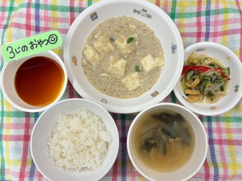 今日のメニューは、ごはん、わかめスープ、マーボー豆腐、中華サラダ、牛乳です。ふわふわのお豆腐、ヘルシーだけどひき肉が入って満足度が高いですね😋3時のおやつは、プリンです。
