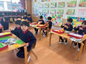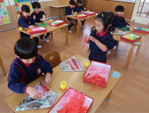 「花紙が手につくね」と言いつつ、丁寧に貼る子どもたちでした。明日以降も完成に向けて製作を行っていこうと思います♪