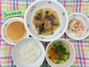 今日のメニューは、ごはん、すまし汁、すき焼き風煮込み、大根サラダ、牛乳です。昨日に引き続き、三隈幼稚園産のお野菜が入っています!本日は白菜と大根でした😋3時のおやつは、ホットケーキです。