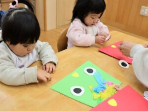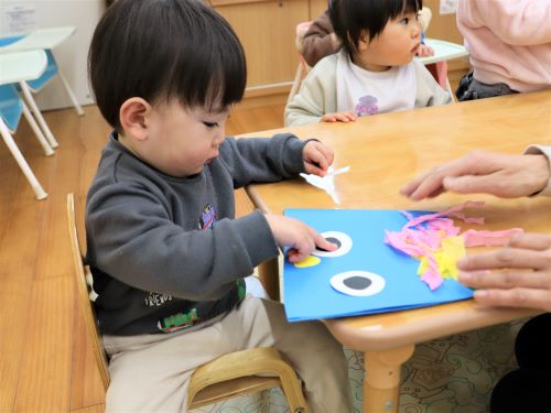 うさぎ組さんも、大きいクラスのおともだちと同じように鬼のお面作りをしています♪昨日はお花紙で髪の毛を作り、今日は続きで目を貼りました👀しっかりとお話が聞けていたので、渡すと自分たちで両面テープを剥がし、目をペタッと貼っていきます👏