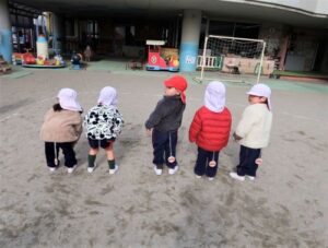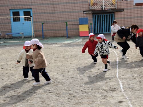 白線から出ないように、思い切り鬼から逃げ回ります(たまに出ちゃうこともあります🤭)。「あーつかまっちゃった」と言いながらも、すぐに気持ちを切り替え、逃げ回っているおともだちを応援していました✊😆「次は僕が鬼をしたい!」と、交代しながら繰り返し楽しむことができました🎶