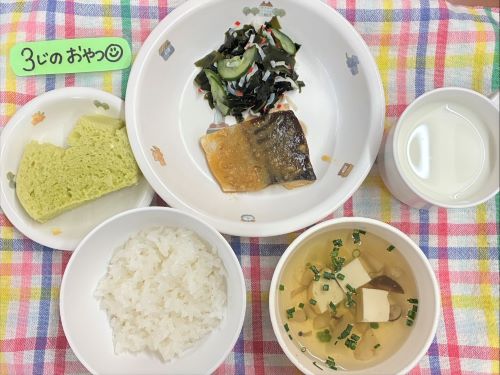 今日のメニューは、ごはん、すまし汁、さばのみそ煮、わかめの酢の物、牛乳です。みそ煮のサバ人気はお肉をこえるかも。パクパク食べていましたよ😋3時のおやつは、抹茶蒸しパンです。