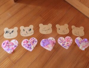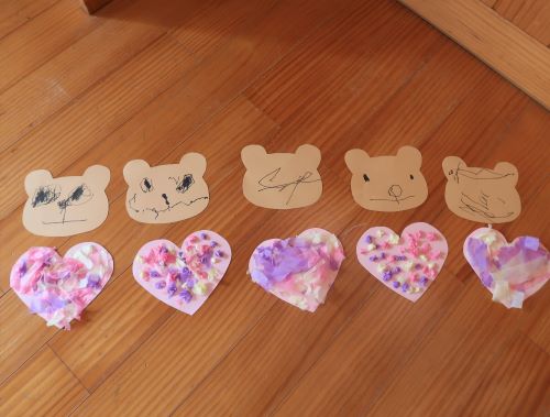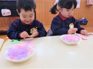 きりん組さんは、バレンタインの製作をしました💝お花紙をたくさんちぎって、ハートの画用紙に貼ります。ちぎってそのまま貼ったり、丸めて貼ったり、それぞれ違うハートの飾り付けができました💕