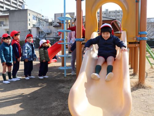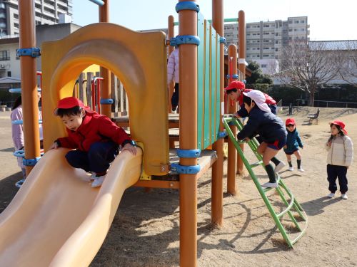 梅組さんはパトリアへお散歩に行きました。「お遊戯会できたね~😆」と、お話をしながら、楽しく向かいました🎶パトリアに着くと、園にはない遊具もあり、特に段のある滑り代がお気に入りで、何度も何度も楽しむ子どもたちでした♪