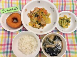 今日のメニューは、ごはん、わかめスープ、八宝菜、ブロッコリーとたまごのサラダ、牛乳です。今日はとっても寒かったけど、春らしい色あいのサラダで気分はポカポカ😋3時のおやつは、ドーナツです。
