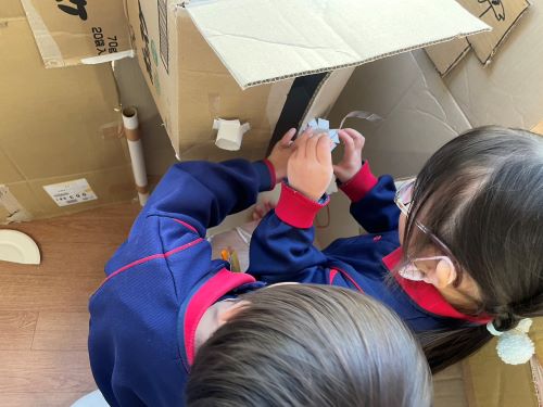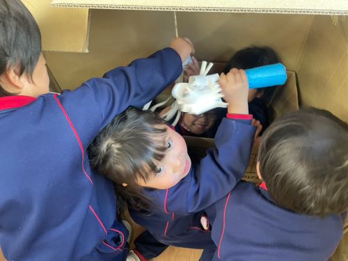 家の壁ができたことで、「冷蔵庫いるんじゃない?」や「お風呂にしよう!」など、子どもたちのたくさんのアイデアで、本格的な家が出来てきました⭐️
