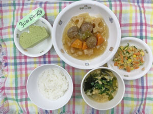 今日のメニューは、ごはん、たまごスープ、肉団子の甘酢あん、サウザンサラダ、牛乳です。😋3時のおやつは、小松菜蒸しパンです。