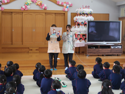 先生が、なぜひな人形を飾るのかを紙芝居で教えてくれました。
