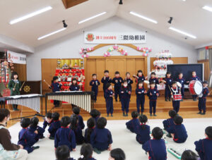 松組さんは「にじのむこうに」を、鉄琴、木琴、タンブリン、カスタネット、鈴、小太鼓、大太鼓を使って演奏してくれました🎵