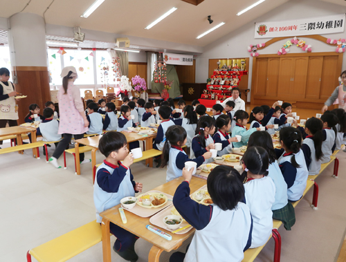 給食はみんな一緒にホールで「いただきまーす🙏」
