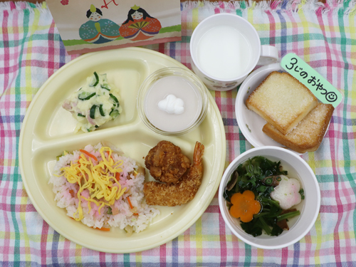 今日のメニューは、ちらし寿司、すまし汁、ポテトサラダ、エビフライ、からあげ、ひなまつり3色プリン、牛乳です。3時のおやつは、年長さんリクエストのシュガートースト🍞です。