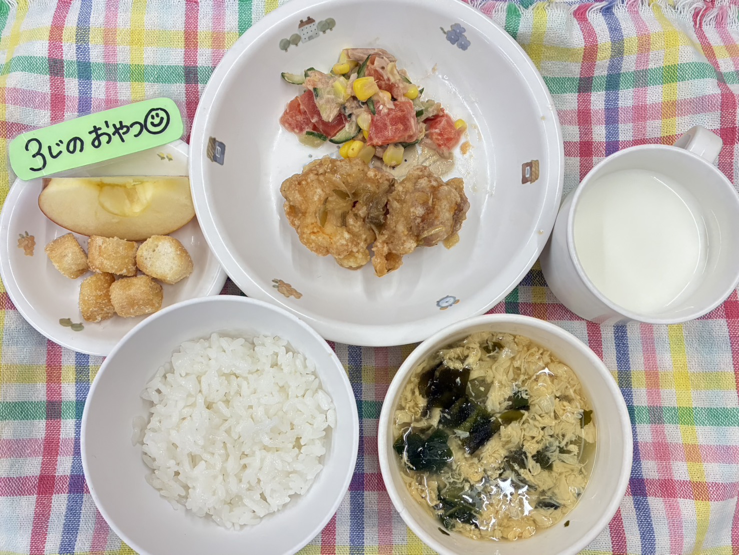 今日のメニューは、ごはん、たまごスープ、ユーリンチー、ツナサラダ、牛乳です。松組さんのリクエストのユーリンチーは、小さいおともだちにも人気です😋3時のおやつは、お麩ラスク・りんごです。