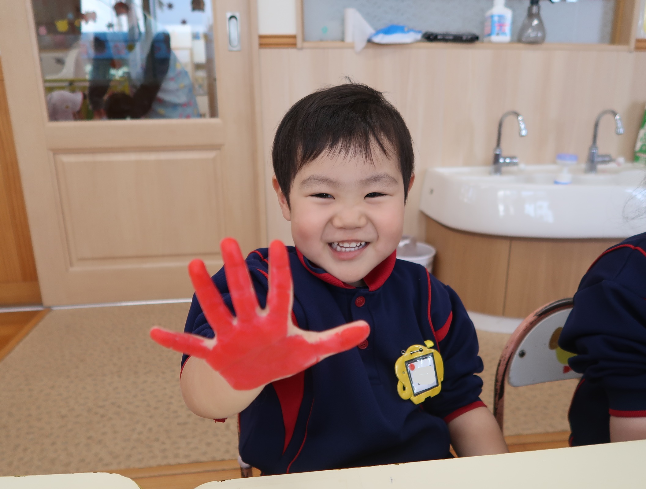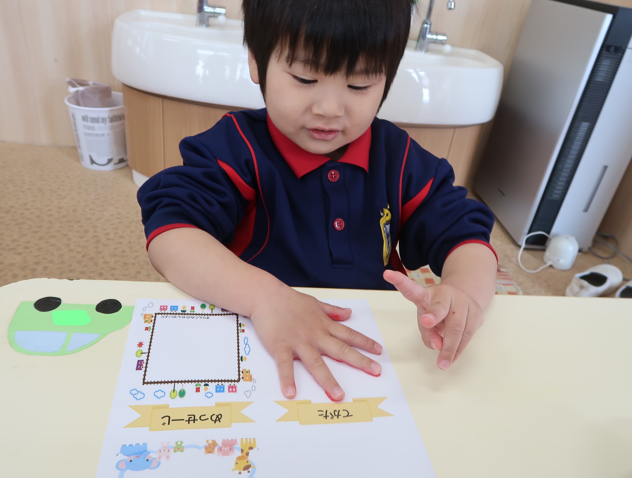 きりん組さんは、思い出用の手形をとりました✋筆で塗られるのにくすぐったさもありますが、誕生会・製作等いろいろな場面で手形をとってきたので、こどもたちも慣れたものです👍