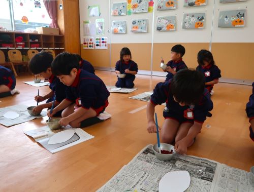 今日は11月の製作をしました。10月に自分たちで掘ったさつまいもを、画用紙と絵の具を使って作ってみました🍠ハサミの持ち方や、持っていないほうの手の動かし方に気をつけながら切る子どもたちでした✄