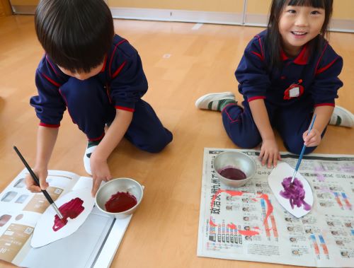 「青は少なめ、赤は多めじゃない?」「青と赤、同じくらいだよ‼」と、絵の具の分量も自分たちで考え、素敵なさつまいもができました✨