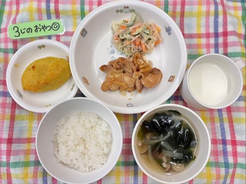 今日のメニューは、ごはん、わかめスープ、鶏肉の照り焼き、春雨サラダ、牛乳です。😋3時のおやつは、スイートポテトです。三隈幼稚園のみんなが頑張って掘ってくれたおいもで作りました🍠