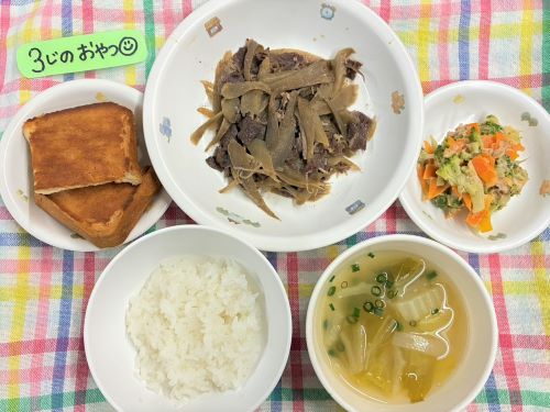 今日のメニューは、ごはん、みそ汁、牛肉のしぐれ煮、ブロッコリーサラダ、牛乳です。ごぼうのいい香りと、甘い味付けでごはんがドンドンすすみました😋3時のおやつは、きなこトーストです。